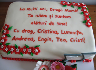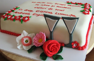 Cristina i-a facut cadou mamei ei la aniversarea varstei de 60 de ani un tort cu un mesaj din partea membrilor familiei. Am adaugat cateva flori pentru culoare si 2 pahare de sampanie si tortul a fost gata repede.