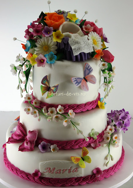 Alexandra este o persoana deosebita si are doua fetite ce-i seamana perfect, frumoase si elegante ca mama lor! Din prima clipa cand am inceput sa stabilim detaliile tortului de botez de Maria Natalia, eram sigura ce tema va alege Alexandra. Nici ca se potrivea altceva mai bine decat un tort cu ploaie de flori... Am ales flori diverse, in culori pastelate, fluturasi si am intregit decorul cu cosuletul fetitei. Sper insa ca ploaia ce se anunta ieri in nordul Bucurestiului sa nu-i fi stricat planurile de petrecere...