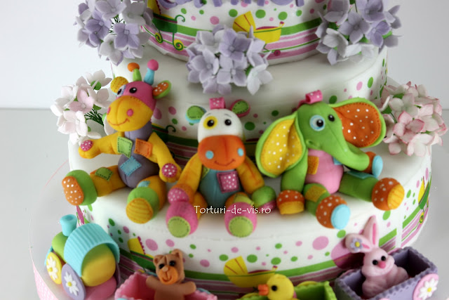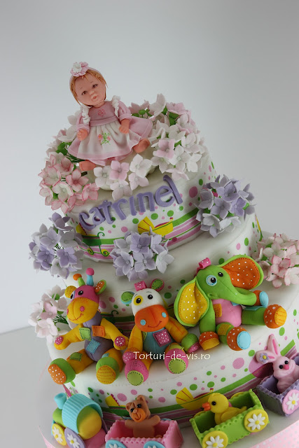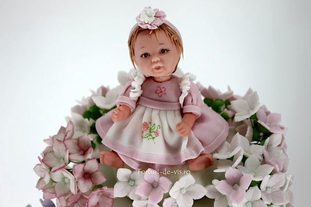 In seara aceasta vreau sa va arat un tort de botez pentru o fetita cu un nume deosebit, Catrinel. Parintii si-au dorit ca tortul ei sa aiba multe elemente diferite, dar pe care le-am combinat armonios: fetita si hortensii, jucarii de plus si trenulet.