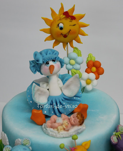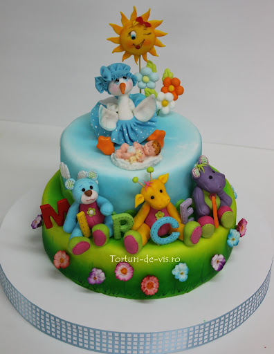 Un tort clasic, cu barza, bebelus si jucarii, este preferat de mare parte din parinti pentru botezul copilului lor. Un astfel de tort a avut si Mircea la botez, colorat frumos, cu barza si jucarii de plus.