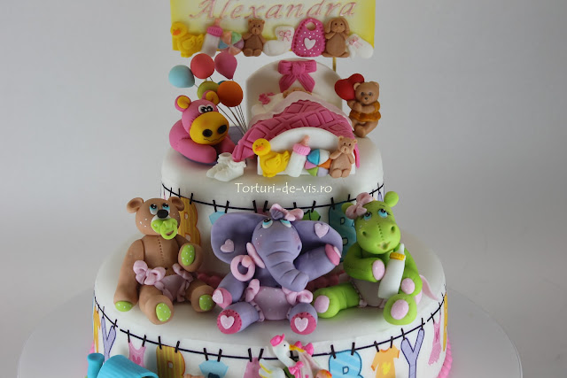 Madalina si-a botezat fetita, pe Timeea Alexandra. Pentru acest eveniment am realizat un tort frumos. Am ales o tema in care am prezentat camera micutei care o asteapta cu jucarii vesele, colorate, ce le imita pe cele de plus.