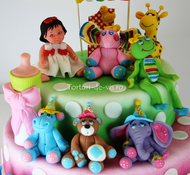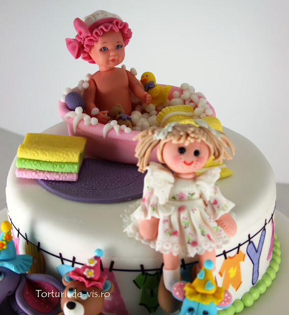 Monica a fost nasa de botez a Dianei si a fost cea care a ales tema tortului. Si-a dorit un tort vesel, cu multe jucarii colorate, pentru care m-am inspirat si de pe invitatie, biberon, trenulet, si o papusa de fetita bruneta si foarte frumusica, cu o rochita exact ca cea pe care urma sa o poarte Diana la botez.