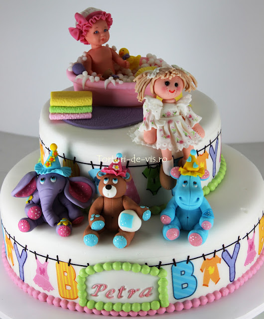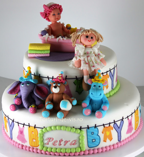 Petra este o fetita tare dragalasa si curioasa sa observe ce este in jurul ei. Cand Sorina a venit sa aleaga tema tortului de botez, a adus si papusa preferata a Petrei pe care sa o realizam din fondant. Fetita la baita cu papusa alaturi si cateva jucarii de plus au facut decorul perfect pentru tortul de botez.