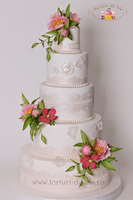Tort de nunta cu bujori roz pentru Alexandra si Cristi