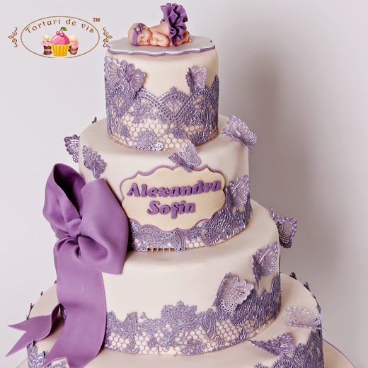 Tort de botez cu dantela si fluturasi pentru Alexandra Sofia