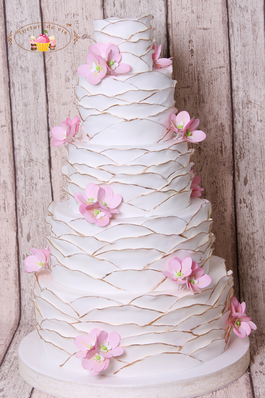Tort de nunta cu ruffles, orhidee roz si accente aurii